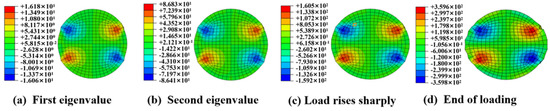 In the second stage, the maximum compressive strain on the tendon end-face expanded gradually from the middle region to both sides and eventually formed a laminar distribution pattern from small to large to small along the vertical direction. This strain distribution indicated that the forces were transferred efficiently at the tendon cross-section. The geometry of the tendon end-face changed from circular to elliptical, indicating that nonuniform deformation occurred in the tendon as the transverse load continued to increase. Accordingly, the load–strain curve began to exhibit nonlinear characteristics in the second stage. For the aluminum plate, the maximum compressive strain was located in the middle region in contact with the tendon, and the strain magnitude difference was small. A majority of the region on the aluminum plate end-face was in a pressure state, and the phenomenon of outwards warping on the two sides almost disappeared. Based on the full-field strain results of the tendon and aluminum plate, it was observed that the contact area between the tendon and aluminum plate was larger than that in the first stage owing to the nonuniform deformation of the tendon. Therefore, a better-fitting contact promoted the stability of the load transfer. For a quantitative comparison, the dividing point (load value) between the first and second stages of the load–strain curve was defined as the first eigenvalue, as shown in Figure 3.