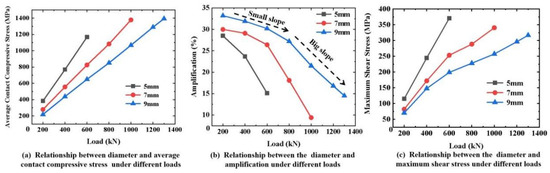 FEMs with different diameters and lengths were built to investigate the effect of size on the contact compressive stress and shear stress of the CFRP tendons. As shown in Figure 12a, the average contact compressive stress decreased with an increasing diameter under the same transverse load. As shown in Figure 12b, the increase in the amplitude between the average contact compressive stress and mutation decreased as the diameter decreased and the load increased. In terms of the contact compressive stress, a higher contact compressive stress appeared when using smaller diameter tendons under the same transverse load. However, a more uniform stress distribution can be obtained. As shown in Figure 12c, the maximum shear stress decreased as the diameter increased. The generation of shear stress requires the consideration of two influencing factors, the mutation degree and the contact compressive stress absolute value. As the diameter increased, the change law in the magnitude and mutation amplitude of the contact compressive stress were opposite. The magnitude of the contact compressive stress is a determinant of the maximum shear stress compared to the mutation. Therefore, a CFRP tendon with a larger diameter has a lower local maximum shear stress.