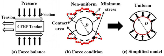 where σ is the longitudinal tensile stress of the CFRP tendon, P is the contact force equal to the minimum contact compressive stress (FEM result) multiplied by the contact area (FEM result), μ is the friction coefficient (0.24) [26,27] between the CFRP tendon and the aluminum plate, and A is the cross-sectional area of the CFRP tendon.
