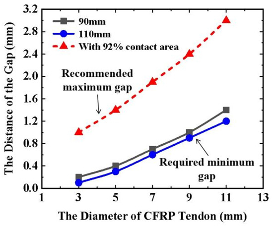 Using 3100 MPa as the target tensile strength of the CFRP tendon [15], the required minimum gap values were investigated using the FEM and Equation (1). For example, a transverse compression model with a particular gap was built in the FEM for a CFRP tendon. The transverse load was conducted on the FEM until the gap completely closed. Then, the minimum contact compressive stress and contact area were extracted from the FEM results to calculate the longitudinal tensile stress using Equation (1). When the longitudinal tensile stress achieves 3100 MPa (a theoretical design value for the strength of the CFRP), the corresponding gap is the required minimum gap for the size of the CFRP tendon. The lengths of 90 and 110 mm were selected in the analytical model for the CFRP tendon owing to their good transverse mechanical properties (as mentioned in Section 3.3). The statistical results for the CFRP tendons with different diameters are shown in Figure 16. Compared to the 90 mm-long tendons, the 110 mm-long CFRP tendons with the same diameter required a larger gap to obtain the target tensile strength. As the diameter of the CFRP tendons increased, the required minimum gap increased. Equation (2) was obtained by fitting the relationship between the minimum gap required and the diameter of the CFRP tendons: