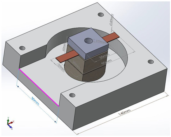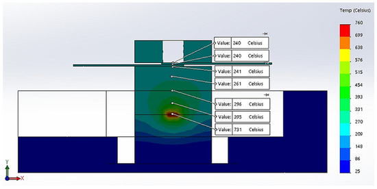 where A (mm2) is the heating transfer area, Th (°C) is the highest temperature obtained from the conversion of the microwaves into heat, Tc (°C) = 25 °C is the ambient temperature considered for simulation and L (mm) = 58 mm represents the total length of the assembly. The simulation was performed considering thermal transient for a boundary time of the 60 s and temperature limit recorded by infrared pyrometer, on the top of copper plates, up to 270 °C. This temperature is considered more than enough to achieve soldering in the microwave field of the copper plates. On the other hand, the time step size for transient thermal analysis is related to element conduction length and material properties. For the simulation, a time step was chosen by taking into consideration Equation (3):