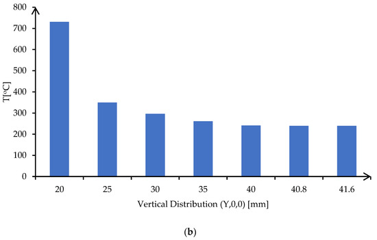 According to the simulation of thermal transient from Figure 2, the temperature distribution, in insulating fire brick, solder alloy, and copper plates, presents a maximum temperature of 731 °C in the center of the firebrick block, which is normal for microwave heating taking into consideration that is a volume heating, and a minimum temperature on the surface of copper plates of 240 °C. The vertical transient of the temperature distribution can be assessed by plotting nodes from the center of the fire brick to the edge. Figure 3a presents the transient of the temperature as a function of time for selected points from the simulation model, and Figure 3b presents the plot of temperature for 7 different locations on the Y axis.