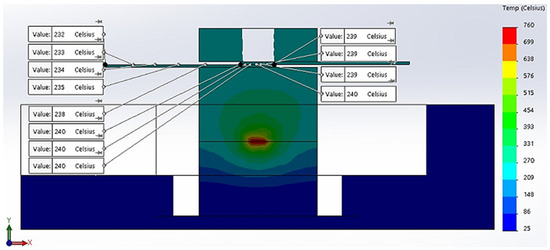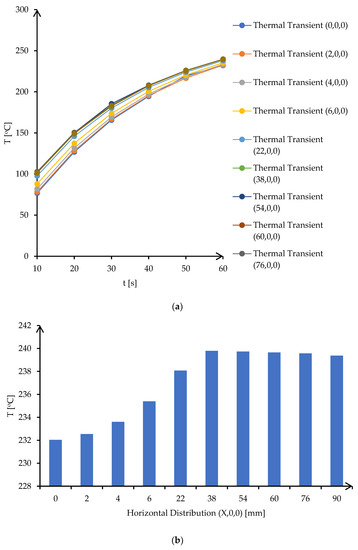 According to Figure 4, the thermal transient simulation and temperature distribution revealed an equilibrium of temperature along copper plates with values between 232 °C and 240 °C. These similar values ensure that temperature in copper plates is uniformly distributed, and soldering application can be successfully implemented on the entire surface of the base material. The simulations of the thermal transient for 12 different locations on the X-axis and temperature distribution along the X-axis are presented in Figure 5a,b.