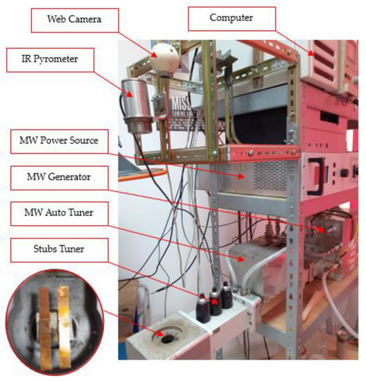The main auxiliary device is an infrared pyrometer CSmicro 3M manufactured by Optris GmbH (Berlin, Germany, 2020) with a temperature range between 50 °C to 600 °C, with a spectral range of 2.3 μm which is ideal for the temperature measurement of metallic surfaces. The control of the infrared pyrometer was performed using Compact Connect supplied by the manufacturer together with IR pyrometer. In addition, for matching load impedance, a Tristan auto tuner was used up to 6000 W, 2450 MHz from Muegge GmbH (Reichelsheim, Germany, 2008). The tunning process, related to matching load impedance, was supported by Homer Software provided by SK-Team d.o.o. (Bratislava, Slovakia, 2008).