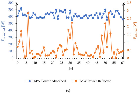 Using the values analytically determined by the lengths of the stub tuners, the microwave soldering process was started with microwave input power set to PMW = 600 W, taking into consideration that the minimum level of injected microwave power was calculated to be set to PMW = 598.89 W. The controlling unit of the microwave generator was set to stop automatically after reaching the limit soldering time of t = 60 s or limiting the soldering temperature to T = 240 °C. Then, for the rest sets of samples presented in Table 1, the microwave power was increased to 650 W, 700 W, and 750 W. Figure 9 presents a snapshot from the matching impedance tuning and the injected power which was recorded using Homer Software.