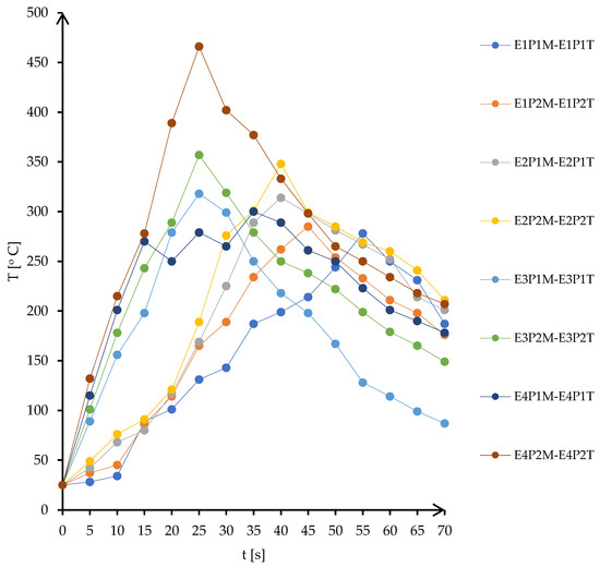 The phenomenon of thermal runaway is observed in the samples produced with a power of 700 W and 750 W, respectively. For these samples, maximum values of 360 °C and 470 °C were reached during heating intervals of 26–27 s, respectively. In these situations, the soldering process is unpredictable, and the temperatures rise very quickly and uncontrollably.