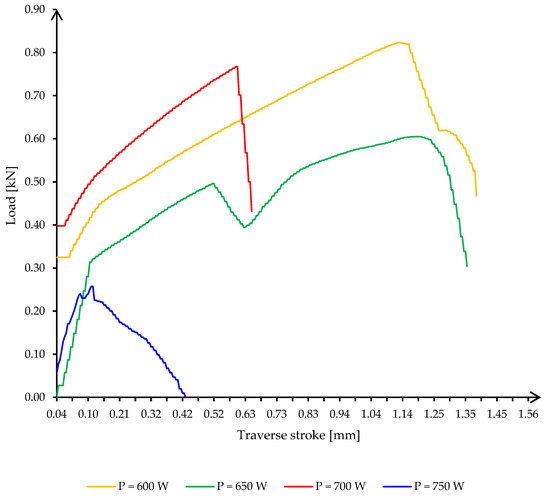 The samples with a power of 650 W and 750 W show a drop in tensile force before reaching the maximum force, indicating either the previous presence of a discontinuity due to uneven or incomplete wetting or the occurrence of microcracks during the tensile test. This drop has no significant effect on the stress–strain curve, it returns to the initial value relatively quickly.