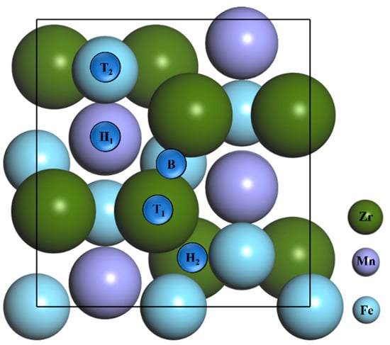 ZrMnFe is one of the representatives of Laves phase impurity removal alloy. The space group is P6/mmc, and cell parameters are a = 5.045 Å, b = 4.856 Å, c = 8.029 Å, α = β = 90° and γ = 120° [27]. The cell model is shown in Figure 1a. The cell parameters of the optimized structure were a = 4.943 Å, b = 4.720 Å and c = 8.251 Å, which were in good agreement with the experimental values. On this basis, the surface structure of ZrMnFe(110) was obtained by cutting ZrMnFe alloy. The ideal surface structure for ZrMnFe(110) cleaning is shown in Figure 1b. The surface structure of six atomic layers was adopted in the calculation, and the height of vacuum layer was set as 15 Å. The coordinates of the bottom four layers were fixed and the rest of the atoms were allowed to relax in the calculation process.