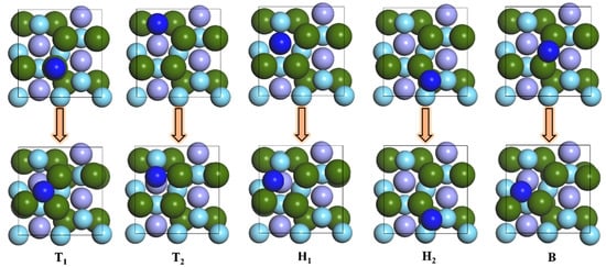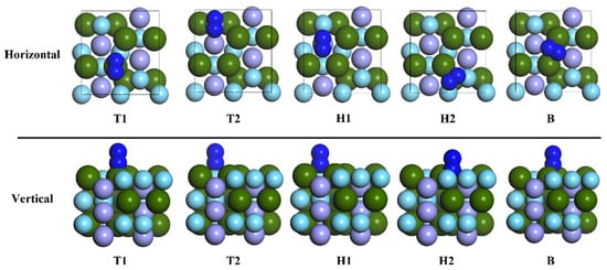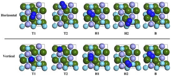 In order to study the adsorption of nitrogen molecules (N2) on the surface of ZrMnFe(110) in detail, five highly symmetric adsorption sites were selected, as shown in Figure 2. Two different adsorption configurations were obtained for each adsorption site according to the orientation of the diatomic molecule. Taking the N2 molecule at Hollow 1 site as an example, the adsorption configuration was denoted as “H1-Hor” when the N2 molecule was placed horizontally on the surface of ZrMnFe(110) and as “H1-Ver” when the N2 molecule was perpendicular to the surface of ZrMnFe(110). Figure 4 displays ten adsorption sites initially set by the N2 molecule on the surface of ZrMnFe(110).