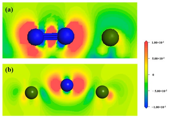 Figure 6 shows the differential charge density diagram of the N2 molecule and N atom adsorbed at Hollow 1 site on the surface of ZrMnFe(110), where the blue area represents electron loss and the red area represents electron gain. It can be seen from Figure 6a that the N2 molecule gained electrons, while the Zr atom lost electrons, accompanied by a large amount of overlapping in the electron clouds between the two N atoms, indicating the existence of a N-N bond. However, there were fewer overlapping areas in the electron clouds between the N atom and adjacent Zr atom, indicating that an ionic N-Zr bond had been formed, but was weaker than the N-N bond. As can be seen from the differential charge density diagram adsorbed by the N atom in Figure 6b, the number of overlapping electron clouds between the N atom and adjacent Zr was significantly higher than that in Figure 6a, indicating that the interaction between the N atom and Zr atom was enhanced after the dissociation of the N2 molecule. More importantly, the electron cloud of the N atom was not uniformly distributed around it but towards the side of the Zr atom, which indicates that N-Zr bond also had covalence.