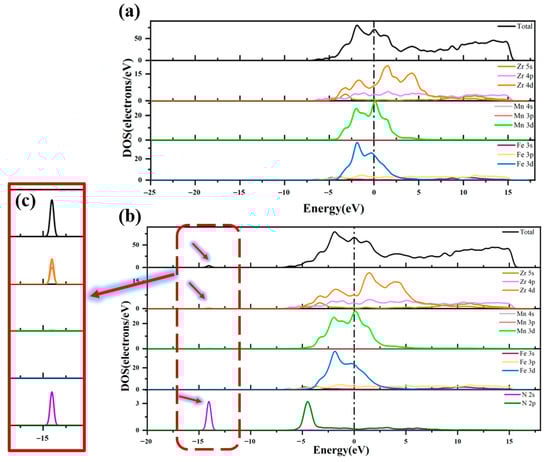 Total state density and partial state density diagram (a) before and (b) after adsorption of N atom on ZrMnFe(110) surface and (c) the region enlarged view.