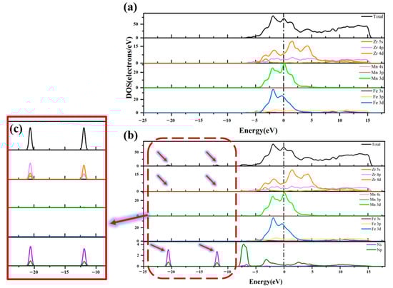 Figure 8 compares the DOS diagrams before and after the adsorption of the N2 molecule at Hollow 1 site on the ZrMnFe(110) surface. As can be seen from the figure, the shape of the total state density diagram basically remained unchanged after adsorption, but the total state density of the adsorption surface formed newly appeared peaks at −20.61 eV and −11.93 eV, respectively. It can be seen from PDOS that these two peaks were contributed by the state density peak of the N atom, indicating that the state density of the N2 molecule were split after adsorption. Hence, it can be concluded that the N2 molecule had been dissociated to a certain extent. In addition, as shown in Figure 8c, new density peaks appeared at −20.61 eV and −11.93 eV in the 4p orbitals of Zr after adsorption, respectively, which was also attributed to the hybridization of the N atom by the Zr atomic orbital.
