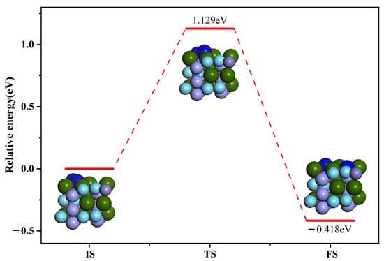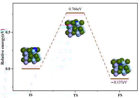 Based on the above method, we calculated the transition state of the N atom infiltrating from the ZrMnFe(110) surface to the inner layer. The optimal path of the N atom penetration is shown in Figure 10. The results demonstrated that the maximum energy barrier to be overcome during the N atom penetration was 0.766 eV, lower than that in the case of N2 molecule dissociation.