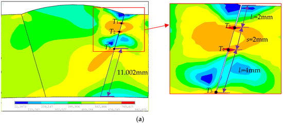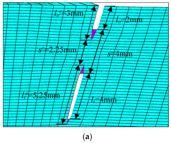 In order to analyze the influence of crack spacing on crack propagation, finite element models with initial crack spacings s = 2 mm, 4 mm, 6 mm, and 8 mm were established, respectively. Figure 15a–c, respectively, show the model diagrams of the crack tip T1 extending by four finite elements when s = 4 mm, s = 6 mm, and s = 8 mm. When s = 2 mm, the model of crack tip T1 extending by four finite elements is depicted in Figure 12b.