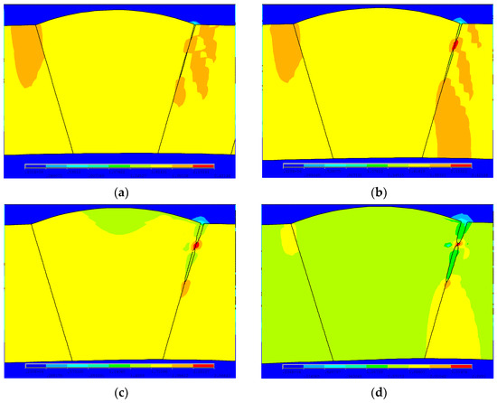 Since the peak position of the von Mises stress distribution field is at the crack tip, the position and number of cracks can be judged. Extracting s = 2 mm during the crack propagation process of the double crack in the Figure 2a above, the von Mises stress distribution field of the crack tip T1 extending by one, two, three, and four finite elements, that is, the von Mises stress distribution fields of ENT1 = 1, ENT1 = 2, ENT1 = 3, and ENT1 = 4, are depicted in Figure 9a, Figure 10a, Figure 11a and Figure 12a. In Figure 9b, Figure 10b, Figure 11b and Figure 12b, the length of the outer wall crack is expressed by loe, and the length of the internal crack is expressed by lie. The distance between the crack tip T1 and the crack tip T2 is denoted by se. Grid reconstructions are shown in Figure 9c, Figure 10c, Figure 11c and Figure 12c. It is seen from Figure 9, Figure 10, Figure 11 and Figure 12 that as the crack propagates, the peak position of the von Mises stress distribution field also changes, and there is a one-to-one correspondence. For example, in Figure 12b, when ENT1 = 4 and ENT2 = 3, the distance between the crack tip T1 and the crack tip T2 is a finite element, se = 0.25 mm, while in Figure 12a, the corresponding peak position coordinates of the von Mises stress distribution field at this time are (15.752, 1741.84) and (16.002, 1856.01), and the distance between the two peaks is 16.002–15.752 = 0.25 mm. The von Mises stress distribution fields of ENT1 = 1, ENT1 = 2, ENT1 = 3, and ENT1 = 4 are summarized in Figure 13. This figure shows that when the crack tip begins to propagate, the von Mises stress value at the crack tip increases as the crack propagation process intensifies. From Figure 13, the crack propagation process and position can be monitored more clearly. Figure 14a–d show the magnetic induction intensity nephograms when extracting crack tip T1 extending by one, two, three, and four finite elements, and Figure 14e shows the magnetic induction intensity component curves when extracting crack tip T1 extending by one, two, three, and four finite elements. With the increase in the crack propagation process, the greater the peak value of the von Mises stress at the crack tip, the greater the deformation at the crack position, which affects the magnetic field distribution of the pipeline weld during the crack propagation process, so the peak value of the detected magnetic induction intensity component shows an increasing trend.