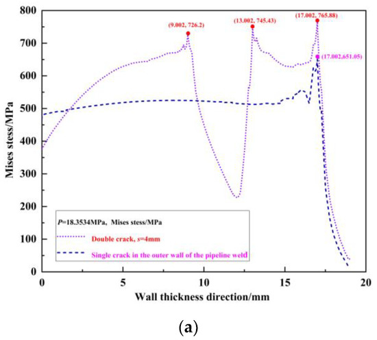 The von Mises stress during the propagation process of the outer wall single crack (p = 20.7534 MPa), the internal single crack (p = 21.3534 MPa), and the unequal-length double cracks (p = 18.3534 MPa) in the loading step before the crack propagation were extracted. Their distribution cloud maps are shown in Figure 3a, Figure 4a and Figure 5a, and the von Mises stress distribution fields of their corresponding crack propagation path are shown in Figure 3b, Figure 4b and Figure 5b. It can be seen from Figure 3 that the peak value of the von Mises stress distribution field of the crack propagation path is located at 2 mm from the outer wall, which is at the crack tip T1′ of the single crack on the outer wall. Additionally, it can be seen from Figure 4 that the two peaks of the von Mises stress distribution field of the crack propagation path are located at 4 mm and 8 mm from the outer wall, which are the crack tips T2′ and T3′ of the internal single crack. In Figure 5, it appears that the three peaks of the von Mises stress distribution field of the crack propagation path are located at 2 mm, 4 mm, and 8 mm from the outer wall, which are the double crack tips T1, T2, and T3. From Figure 3, Figure 4 and Figure 5, it can be seen that the place where the von Mises stress is the largest is at the crack tip; the distance between the peak value of the von Mises stress distribution field and the internal or outer wall of the pipeline is consistent with the distance from the crack tip to the internal or outer wall of the pipeline. Therefore, the position of the single crack or double crack tips can be judged from the peak position of the von Mises stress distribution field.