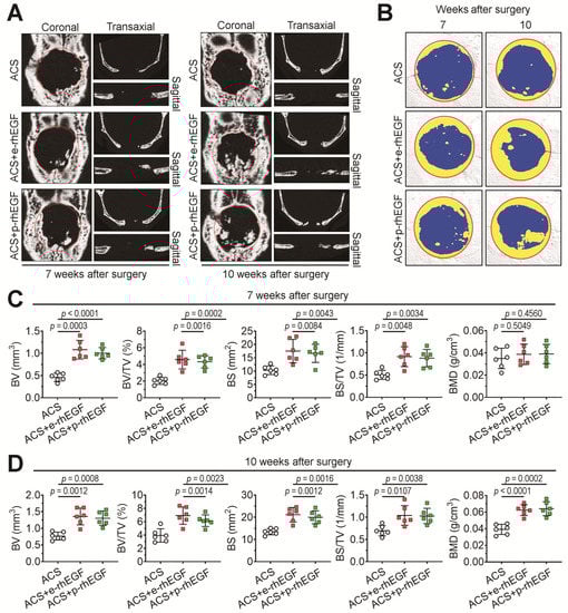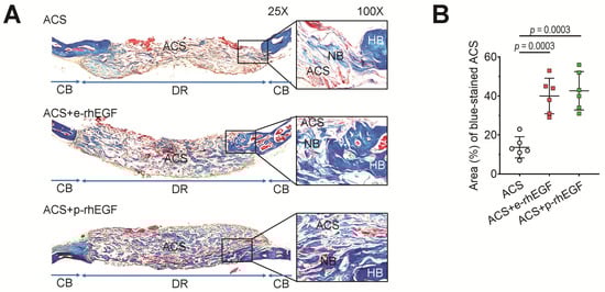 3.2. Implanting the p-rhEGF-Impregnated ACSs Promotes New Bone Formation in Calvarial Defects Greater Than ACSs Alone Do