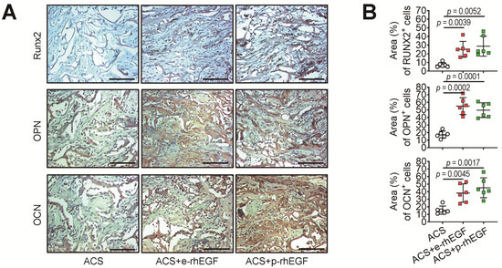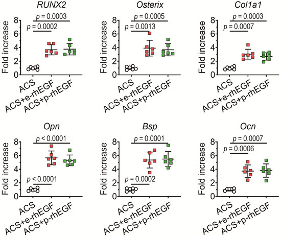 3.3. Enhanced New Bone Formation in the ACS + p-rhEGF Group Is Correlated with the Increased Expression of Osteogenic Marker Molecules