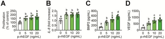 3.4. Exogenous Addition of p-rhEGF Augments Proliferation and Induction of IL-8, BMP2, and VEGF in hPDL Cells