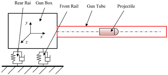 As shown in Figure 1, it is a simplified artillery model, whose barrel is a typical cylindrical shell structure. Usually, for the study of the dynamics of the gun barrel, the beam theory was mainly used to simplify the modeling [1,2]. Yet in fact, the theory of the beam model only takes into account the radial vibration of the barrel, which cannot describe the complete dynamics of the cylindrical barrel. Therefore, it is necessary to establish the cylindrical shell model using 3D elastic theory for analysis to obtain accurate vibration characteristics of the cylindrical shell.