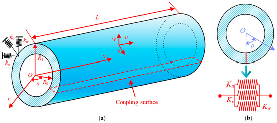 The spring constraint is applied at the end of the shell to represent the boundary conditions, containing three sets of linear springs , , and , the superscript i = 0 means that the boundary spring is arranged at the x = 0 end of the cylindrical shell, and i = L means that it is arranged at the x = L end. Thus, all homogeneous boundary conditions can be obtained directly by setting suitable spring stiffness values. In addition, the kinematic and physical continuity conditions of a complete rotating shell should be satisfied at the circumference θ = 0 and θ = 2π. Therefore, coupling springs are set in these two surfaces in this paper. The three groups of face springs are denoted by Ku, Kv, and Kw (Figure 2b).
