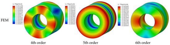 Table 6 shows the dimensionless frequencies determined by the various methods in order to further contrast the differences between the approach used in this paper and the modeling approach that takes the cylindrical shell’s circumferential symmetry into account. The geometric and material parameters of the shell are: inner–outer ratio R0/R1 = 0.5, length–radius ratio L/R1 = 2, and μ = 0.3. The total number of meshes for the FEM model is 124,000, and the mesh type is a 3D hexahedral mesh. As indicated by the data presented in the table, it can be observed that the current method yields highly accurate calculation results when compared with the literature method. Furthermore, the frequencies of the cylindrical shell can be determined in a sequential manner. When compared with the calculation results obtained from FEM, it is evident that the method proposed in this paper exhibits a high degree of consistency. In particular, the first twenty orders of modalities can be accurately calculated using this method. The corresponding mode shapes are drawn in Figure 3. From the comparison of modal pictures, it can be seen that the current solution conforms well with the FEM, and all the vibration patterns can be effectively represented. It should be particularly noted that the fifth-order mode is an asymmetric mode.