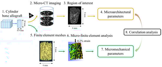 To evaluate the correlation between microarchitecture features and the micromechanical properties within a scaffold requires a study coupling scaffold imaging and micro-finite element simulations. The scaffold analyzed in the present study is a bone allograft. This choice is related to several elements, including (i) bone allografts are classically used in the repair of bone defects in clinical practice; (ii) bone allografts come from bone banks and are therefore easily accessible for future studies; and (iii) bone allografts are harvested from human femoral heads and therefore correspond to a standard trabecular bone tissue microarchitecture. In addition, bone allografts are mineralized tissues that allow the use of X-ray micro-CT imaging at the micrometer scale. The high resolution of the micro-CT images enables both the determination of the scaffold microarchitectural parameters and the implementation of a micro-finite element simulation method. All these experimental and numerical methods applied on a large number of scaffolds (i.e., 29) provide a large amount of data that allows the implementation of a multilinear regression analysis and the emergence of key microarchitectural parameters in the prediction of the micromechanical loading. A detailed experimental design is illustrated in Figure 1.