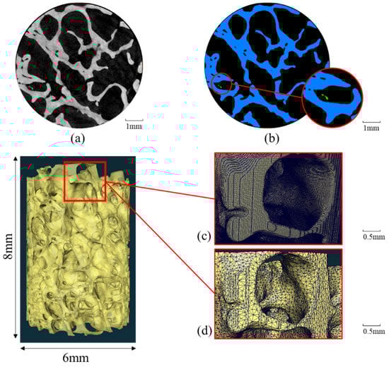 The 3D micro-CT images were used to generate finite element meshes, as shown in Figure 2. The meshing process was performed using Avizo® software (v. 2021.1, Berlin, Germany). The 3D images were converted to 8-bits and a 3D median filter of 3 voxels was applied to reduce noise and increase image contrast. Unconnected components were detected using Avizo®’s built-in label analysis method (Figure 2b) and were removed prior to surface generation. The original mesh surface (Figure 2c) was then simplified by the software, as shown in Figure 1d. A preliminary study was conducted specifically for this simplification step in order to maintain a good compromise between model accuracy and computational cost. In the end, the surface mesh was close to 2,000,000 facets and 500,000 nodes for each sample. A detailed description of the procedures for micro-finite element meshing is given in Supplementary Materials Section S2.