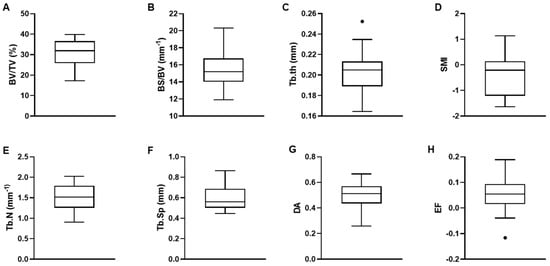 Box-whisker plots of microarchitectural parameters derived from CTAn, except for EF derived from Bone J: (A) Bone volume fraction (BV/TV); (B) Bone surface-to-volume ratio (BS/BV); (C) Trabecular thickness (Tb.Th); (D) Trabecular number (Tb.N); (E) Trabecular separation (Tb.Sp); (F) Structure model index (SMI); (G) Degree of anisotropy (DA); (H) Ellipsoid factor (EF). Box center lines, bounds of boxes, and whiskers indicate median, first and third quartiles, and minima and maxima within a 1.5 times interquartile range (IQR), respectively, points in the graph are outliers, N = 29.