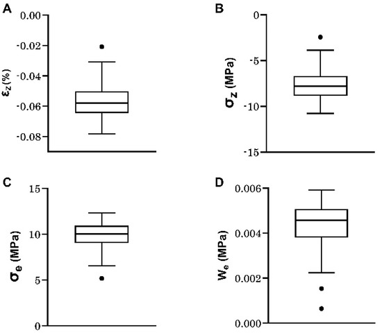 For each of the 29 samples, numerical micro-finite element simulation allowed the characterization of the mean strain εz and mean stress σz in the compression axis, the mean von Mises stress σe, and the mean strain energy density We. All parameters were calculated by averaging all the elements of the meshes, and their values are shown in Figure 4. The mean values and standard deviations measured for all the samples were equal to −0.056% ± 0.013 for εz, −7.7 MPa ± 1.95 for σz, 9.9 MPa ± 1.66 for σe, and 0.0043 MPa ± 0.0012 for We. All the micromechanical parameters for individual samples are given in Supplementary Table S2.