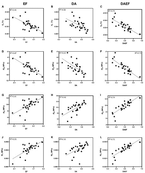 The DAEF index was calculated for all 29 samples. Figure 5 shows the linear correlation between each of the micromechanical parameters investigated in the present study, and DA, EF, and the new index DAEF.
