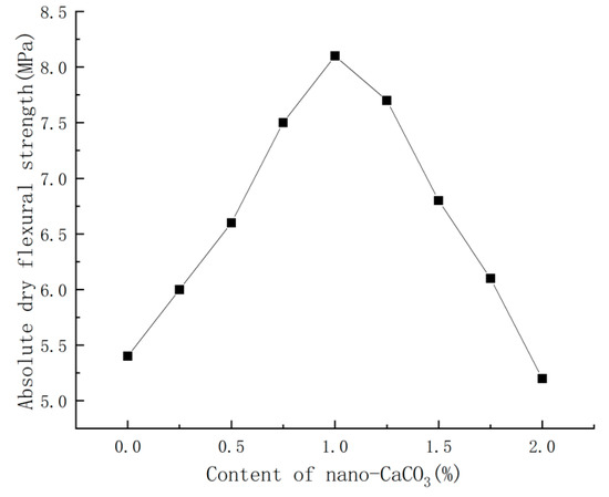With the water requirement of standard consistency being unchanged, the content of nano-CaCO3 was varied to compare the corresponding changes in absolute dry flexural strength of PBG. The comparison results were shown in Figure 4.