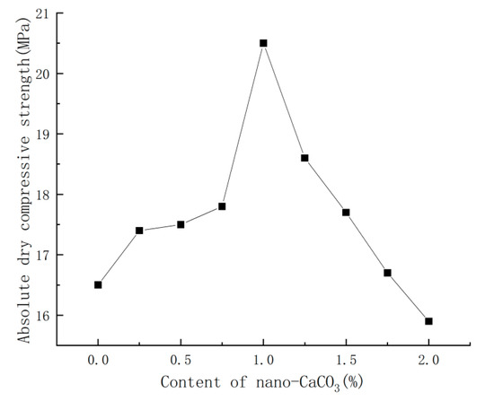 It could be seen from Figure 5 that, with the increase in nano-CaCO3 content, the absolute dry compressive strength of PBG showed a trend of first increasing then decreasing. When the content of nano-CaCO3 was 1%, the absolute dry compressive strength of PBG rose to 20.5 MPa as the maximum, which was 24% higher than that of the blank group; when the content of nano-CaCO3 exceeded 1%, the absolute dry compressive strength of PBG started to decrease. When the content of nano-CaCO3 reached 2%, the absolute dry compressive strength of PBG dropped to 15.9 MPa, which was 4% lower than that of the blank group.