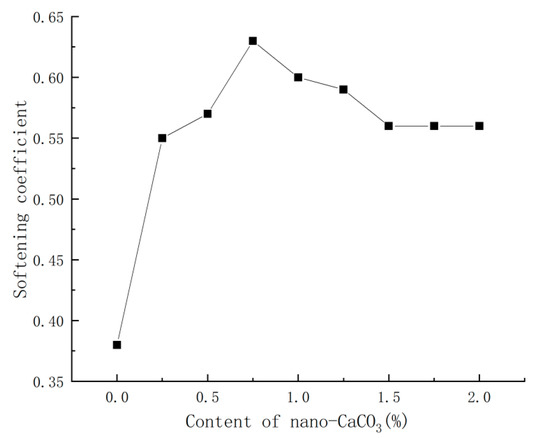 With the water requirement remaining unchanged, the content of nano-CaCO3 was varied for comparing the corresponding changes of PBG’s softening coefficient. The comparison results were shown in Figure 7.