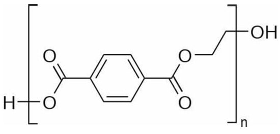 PET production starts with the reaction of either terephthalic acid or dimethyl phthalate with ethylene glycol to produce bis(hydroxyethyl) terephthalate. The latter undergoes a prepolymerization and polycondensation process to reach a weight-averaged molecular weight () of around – g/mol. The molecular weight can be increased by solid-state polymerization up to values of the order g/mol [9]. As the reaction involves polycondensation with high degree of conversion, the polydispersity index is generally around 2 [13]. The repeating unit of PET is reported in Figure 1.