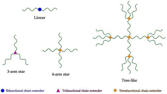 The glycidyl group of TGIC prefers to interact with the carboxyl end group of linear PET chains [41]. One of the possible branching architectures that can be formed is a star structure, with a maximum of three arms [33]. Compared to other chain extenders, the low functionality of TGIC results in a lower degree of branching.