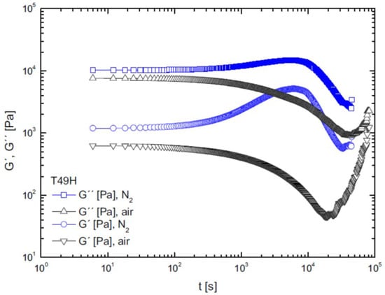 In 2015, Härth et al. [71] examined the stability of a commercial PET resin via time sweep tests by studying the influence of process variables on polymer degradation. As an example of a rheological test to monitor degradation, Figure 3 reports the viscoelastic moduli as functions of time; changes in the and curves can be evaluated depending on the inert gas used, the type of atmosphere (air or nitrogen), and the water content of the sample in order to assess the influence of drying.