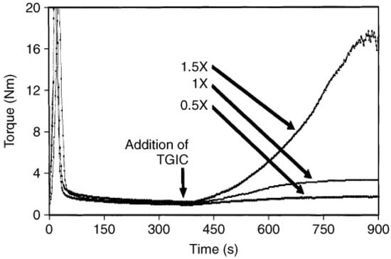 Like TGIC, tetraglycidyl diamino diphenyl methane (TGDDM) is among the most frequently cited epoxy-branching additives in the literature [18]. TGDDM, a tetrafunctional chain extender, also reacts predominantly with the carboxyl terminal group of PET; this leads to the formation of star-like structures, which randomly interact with each other to create more complex architectures [42]. As for all the other epoxy-based chain extenders, hydroxyl byproducts are also formed, which can react with the carboxyl or epoxy groups to form branched structures [43].