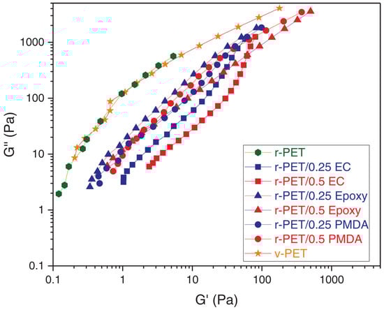 - Daver, F.; Gupta, R.; Kosior, E. Rheological characterisation of recycled poly(ethylene terephthalate) modified by reactive extrusion. J. Mater. Process. Technol. 2008, 204, 397–402. [Google Scholar] [CrossRef]