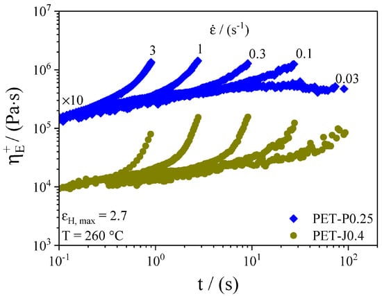 - Kruse, M.; Wang, P.; Shah, R.S.; Wagner, M.H. Analysis of high melt-strength poly(ethylene terephthalate) produced by reactive processing by shear and elongational rheology. Polym. Eng. Sci. 2019, 59, 396–410. [Google Scholar] [CrossRef]