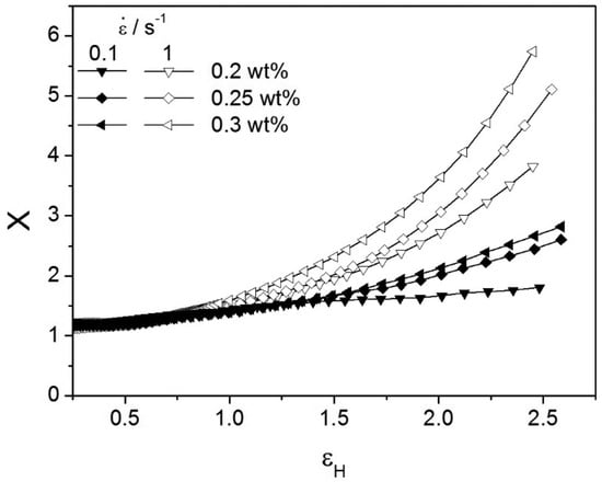 At a constant strain rate, the extensional stress growth coefficient () is evaluated as follows:
