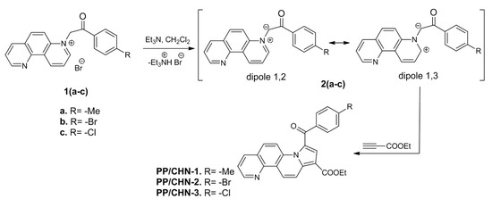The generated N-ylides, acting as 1,3-dipoles, were reacted with ethyl propiolate (as dipolarophile) to produce the desired PP/CHN compounds (Figure 1) [6,12,13].