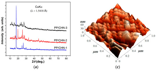 XRD patterns for all three organic layers studied: (a) typical 2D and 3D AFM image (b,c) and the histogram showing the height profiles of the AFM images (d) for the PP/CHN-1 layer made at a scale of 1.0 × 1.0 µm2.