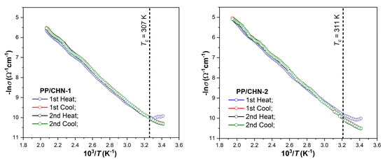 The dependence lnσ vs. 1000/T for two heating–cooling cycles of the studied organic layers.