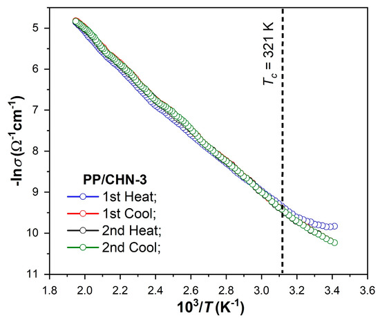 The electrical conductivity of the layers (σ) as a function of temperature was determined for several heating–cooling cycles, confirming the reproducibility of the characteristics and therefore the good stability of the layers in the temperature range ΔT, at which the measurements were made (Table 5). The temperature-dependent conductivities of the organic layers [lnσ = f(1000/T)] for two heating–cooling cycles are presented in Figure 3. According to the band model representation, the conductivity–temperature dependences show two conduction regions (with different slopes) delimited by a certain value of the temperature (Tc), specific to the respective organic layer. Therefore, for the lower temperature range (T < Tc), extrinsic conduction takes place, whereas for the higher temperature range (T > Tc), intrinsic conduction occurs.