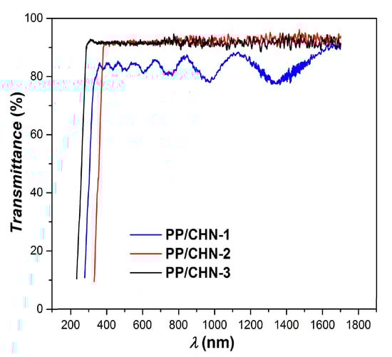 In the visible and near-infrared spectral ranges, the PP-CHN-1 layer exhibits a transmittance of 84%, while that of the PP-CHN-2 and PP-CHN-3 layers is of 92%. In addition, the reflectance (R) values are below 16% for the PP-CHN-1 layer and below 8% for the PP-CHN-2 and PP-CHN-3 layers.