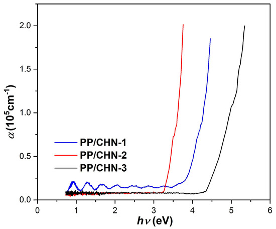 The absorption spectra, which show the absorption coefficient (α) as a function of the incident photon energy (hν), of the organic layers are displayed in Figure 5. It can be observed that the absorbance for all the layers studied increases with an increase in photon energy. The PP-CHN-1 layer shows the greatest increase in absorbance in the UV–VIS region (3.79–4.45 eV), while the PP-CHN-2 layer, in the VIS region (3.23–3.75 eV) and the PP-CHN-3 layer, in the UV region (4.33–5.34 eV).