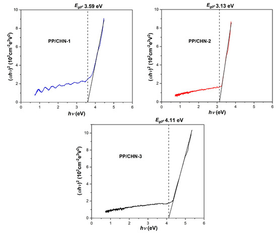 The optical band gap (Ego) was determined from the graphic representation (αhν)2 as a function of hν (Figure 6) by extrapolating the linear region of the graph at zero absorption. The values obtained for the direct band gaps (Egod) were 3.59 eV for the PP-CHN-1 layer, 3.13 eV for the PP-CHN-2 layer, and 4.11 eV for the PP-CHN-3 layer.