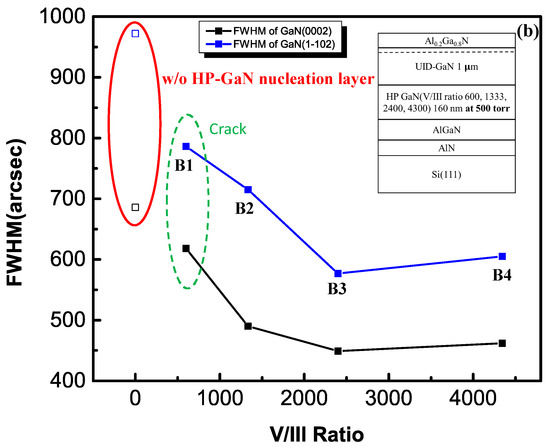 Figure 2b shows the XRD results of the GaN samples (sample B1, B2, B3, and B4) with HP-GaN NL grown using different V/III ratios and the sample without HP-GaN NL (sample A). The sample with HP-GaN NL showed an improvement of the FWHM of GaN(0002) from 600 to 444 arcsec and the FWHM of GaN(1-102) from 790 to 577 arcsec when the V/III ratio was increased from 600 to 2400 (sample B3).