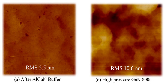 The morphology of the AlGaN/GaN HEMT epitaxy structure in different growth steps in Sample B3 was measured by AFM analysis, as shown in Figure 3. The measurements in Figure 3a–d were taken after AlGaN buffer, HP-GaN NL 400s, HP-GaN NL 800s, and full AlGaN/GaN HEMT growth, respectively. The 3D to 2D transition occurred during HP-GaN NL growth, Figure 3e showed a 3D to 2D transition time of approximately 800s (observed from 405 nm laser reflectance irregular jitter) of the HP-GaN NL growth. The RMS at 400s of HP-GaN NL was 23.1 nm, showing the 3D growth mode, while the RMS at 800s of HP-GaN NL was 10.6 nm, indicating the transition to 2D growth mode. Finally, AlGaN/GaN HEMT morphology RMS was around 2.4 nm.